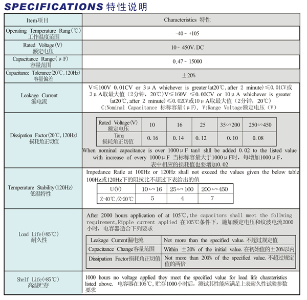 Life Time:105℃,2000hours or 80℃,8000 hours